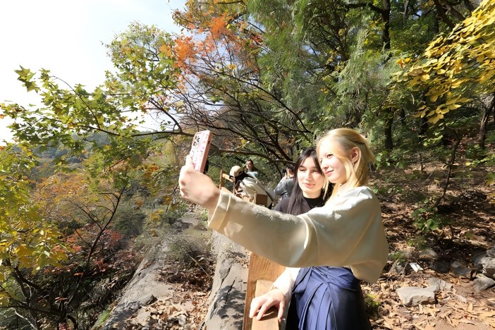 圖為10月26日,俄羅斯女孩在欣賞抱犢崮紅葉。(記者 劉明 通訊員 李宗憲 宋偉 公哲明 攝)