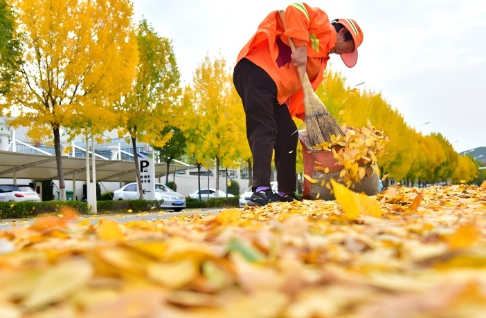 11月4日清晨,環衛工人在山亭區青屏路上清理落葉。