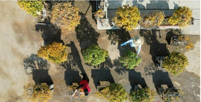 11月6日,在嶧城區萬達精品石榴盆景園,電商人員現場直播修剪、測量石榴盆景,助力石榴盆栽盆景銷往國內外市場。