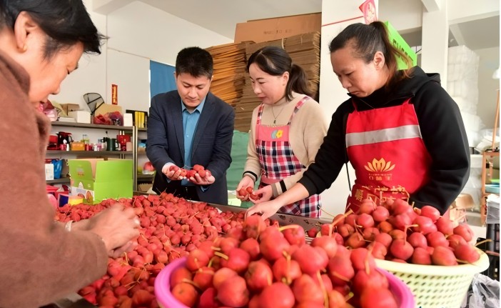 11月13日,在山亭區水泉鎮棠棣峪村農村電商產業園,水泉鎮統戰干部胡開峰(右三)在了解山楂銷售情況。