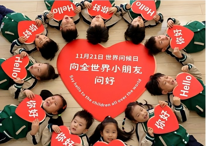 11月20日,市中區絲雨幼兒園的小朋友在向全世界小朋友問好。11月21日是“世界問候日”,我市中小學、幼兒園開展豐富多彩的主題活動,孩子們通過不同的方式表達祝福,傳遞溫情。 (吉喆 段彤彤 攝)
