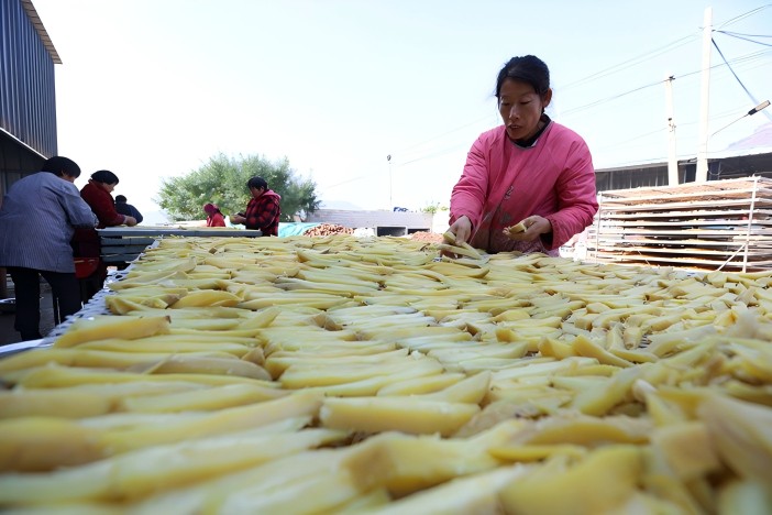 圖為11月21日山亭區水泉鎮石戶峪村村民在晾曬地瓜棗。(記者 劉明 攝)