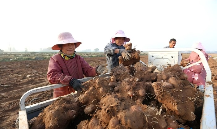 圖為志愿者在劉莊村幫助村民在搶收毛芋頭。