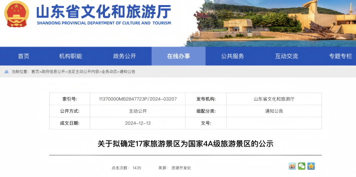 根據《旅游景區質量等級的劃分與評定》國家標準和《山東省旅游景區質量等級管理辦法》,經有關市文化和旅游行政部門推薦,省文化和旅游廳按程序組織綜合評定,以下17家旅游景區達到國家標準要求,擬確定為國家4A級旅游景區,現予公示。名單如下: