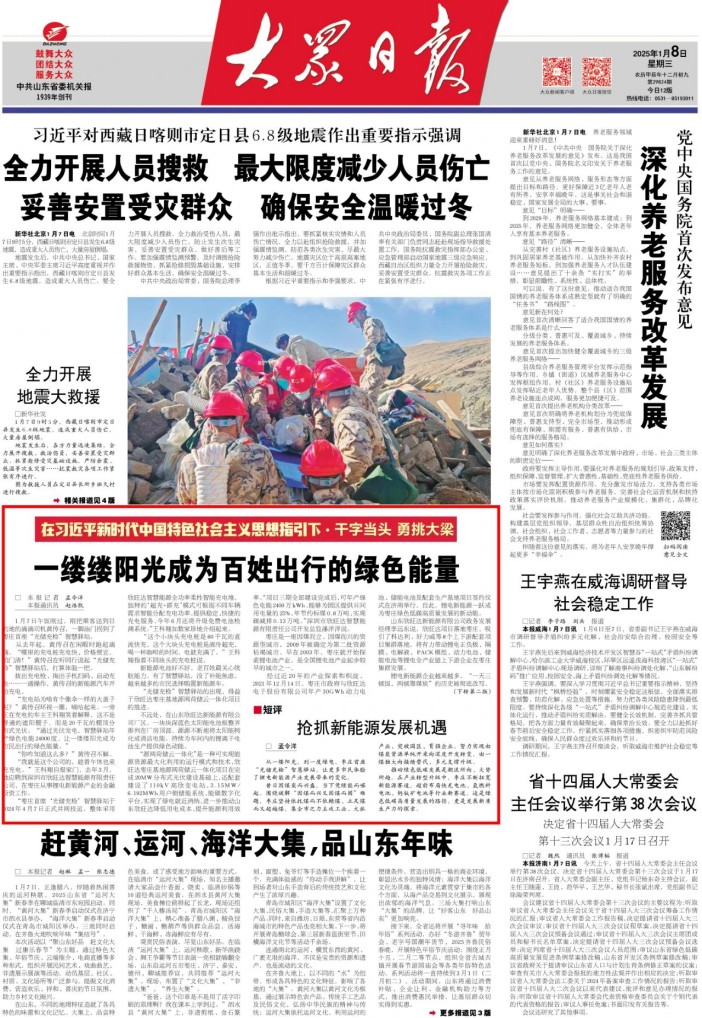 1月8日,大眾日報頭版刊發重點專題稿件《讓一縷縷陽光成為百姓出行的綠色能量》,并配發短評《搶抓新能源發展機遇》,全面介紹了棗莊市錨定“強工興產、轉型突圍”目標,持續拓寬新能源賽道,大力發展新質生產力,推動“煤城變綠城”的生動實踐和突出成效。