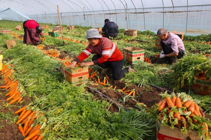 1月13日,棗莊市嶧城區周齊蔬菜種植專業合作社,種植戶們正忙著采收、挑揀、去纓、裝箱、運輸,現場一派豐收繁忙景象。據了解,該合作社種植胡蘿卜215畝,畝均收入10000余元,遠銷北京、河北、杭州等全國各地。不僅提高了經濟效益,還帶動周邊村民增收致富。