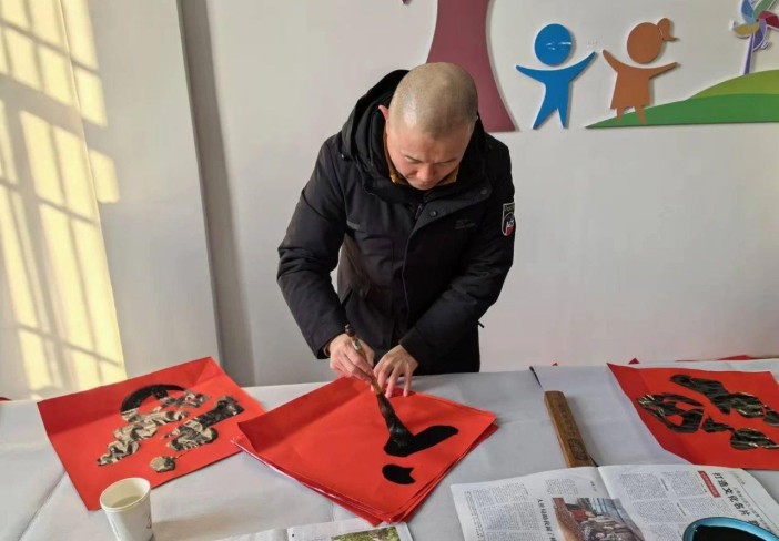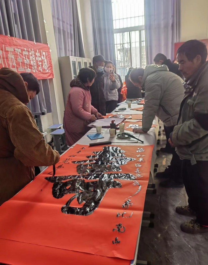 活動(dòng)現(xiàn)場(chǎng)熱鬧非凡,充滿了歡聲笑語(yǔ)。文藝家們一到黃樓村,便迅速投入到創(chuàng)作當(dāng)中。書法家們揮毫潑墨,筆鋒游走間,一幅幅寓意吉祥的春聯(lián)和一個(gè)個(gè)飽含神韻的“福”字躍然紙上。“一帆風(fēng)順吉星到,萬事如意福臨門”“天增歲月人增壽,春滿乾坤福滿門”,這些經(jīng)典的春聯(lián)語(yǔ)句,在書法家們的筆下更具韻味。有的書法家還應(yīng)村民的特殊要求,現(xiàn)場(chǎng)創(chuàng)作個(gè)性化的春聯(lián),將村民對(duì)美好生活的期盼融入到筆墨之中。