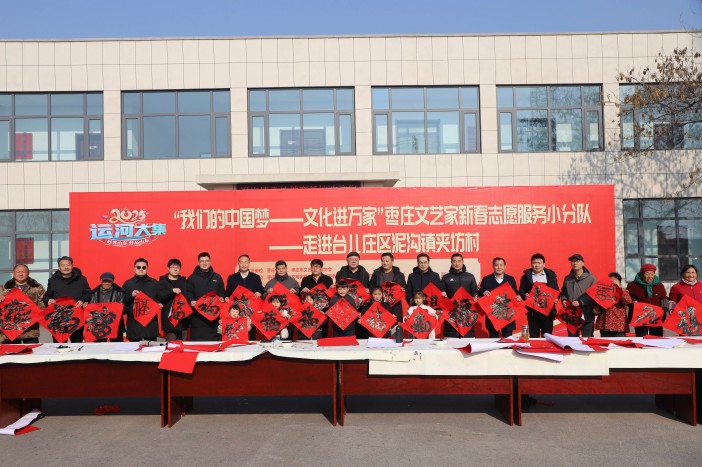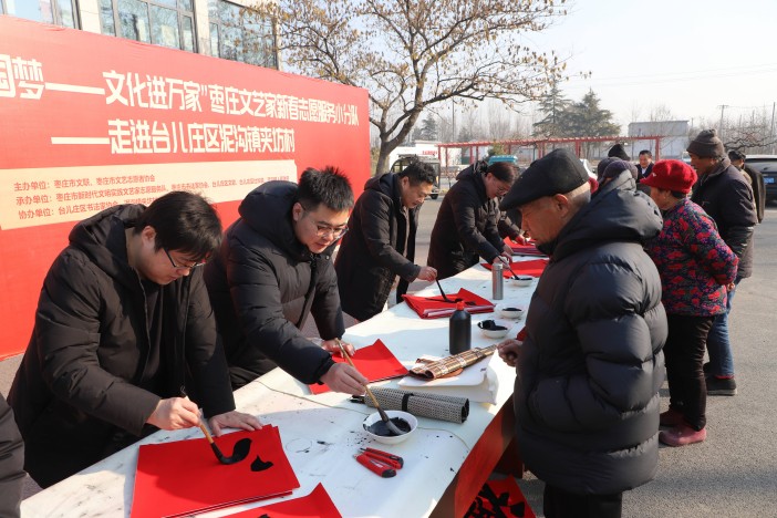 春節將至,歲寒情暖。為營造新春佳節的喜慶氛圍, 1月20日,棗莊文藝家新春志愿服務小分隊走進臺兒莊區泥溝鎮夾坊村,用春聯為廣大群眾賀歲,把“福”送進千家萬戶,讓群眾們真切地感受到濃厚的年味。