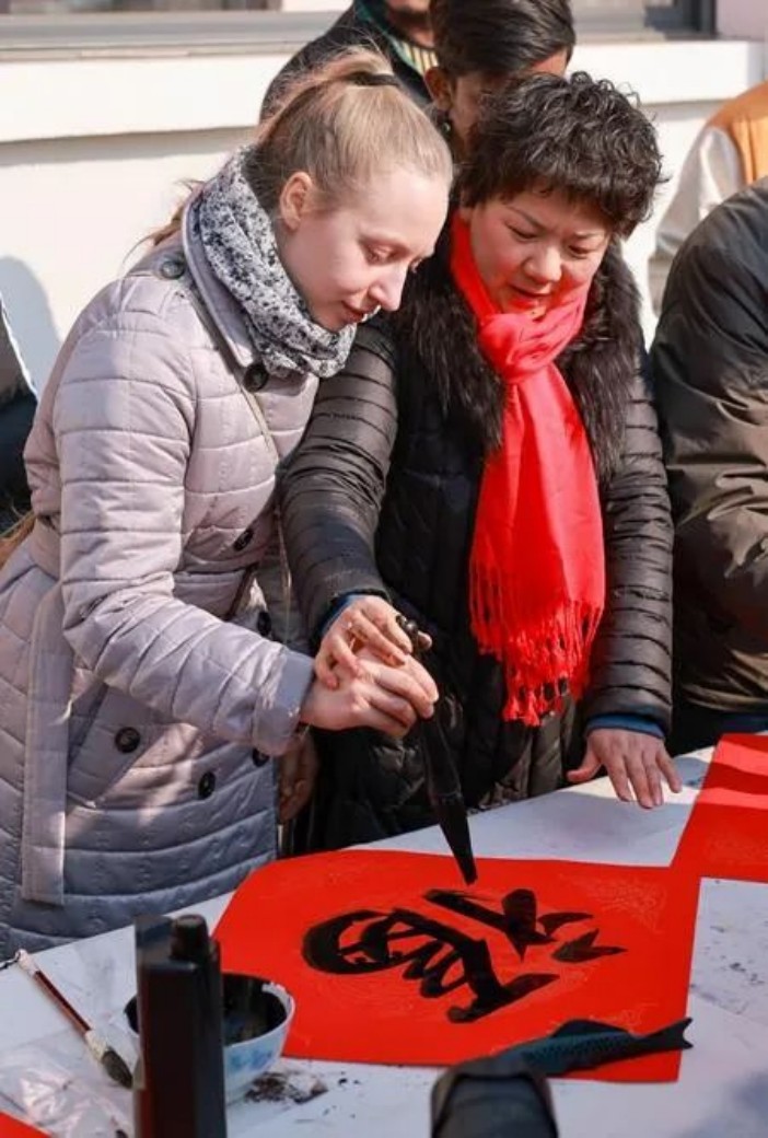 1月21日,在山東省棗莊市薛城區(qū)魯封橋大集,外國(guó)留學(xué)生體驗(yàn)寫(xiě)春聯(lián)。新春臨近,各地舉行寫(xiě)春聯(lián)、寫(xiě)福字活動(dòng),書(shū)法愛(ài)好者揮毫潑墨為廣大市民送去祝福。王龍飛/攝(新華社發(fā))