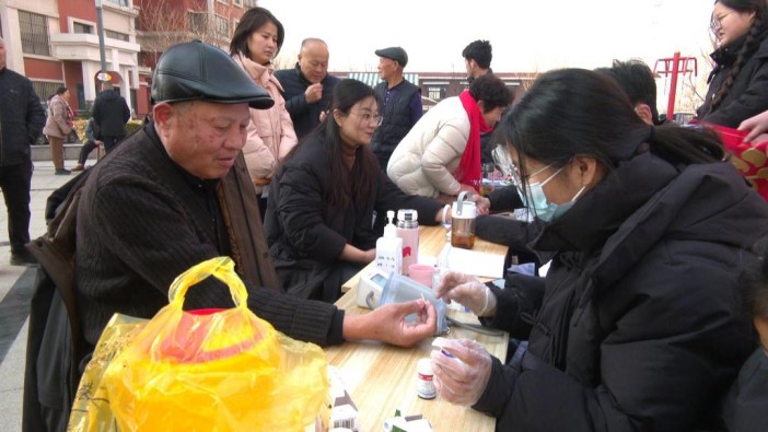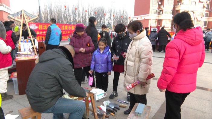 在棗莊高新區德仁社區活動現場,便民服務、健康科普、政策宣傳、趣味游戲、求職招聘等10余個各具特色的專區依次擺開,為社區居民帶來了豐富多樣的服務體驗。在健康科普區,醫護人員耐心地為每一位前來問診的居民解答健康問題,并為他們測量血壓血糖、普及冬季養生知識。在趣味游戲區,居民們一起投壺、套圈,每命中一次便引發現場群眾陣陣歡呼。在便民服務區,磨菜刀、理發、送福字等“攤位”吸引了不少居民駐足。