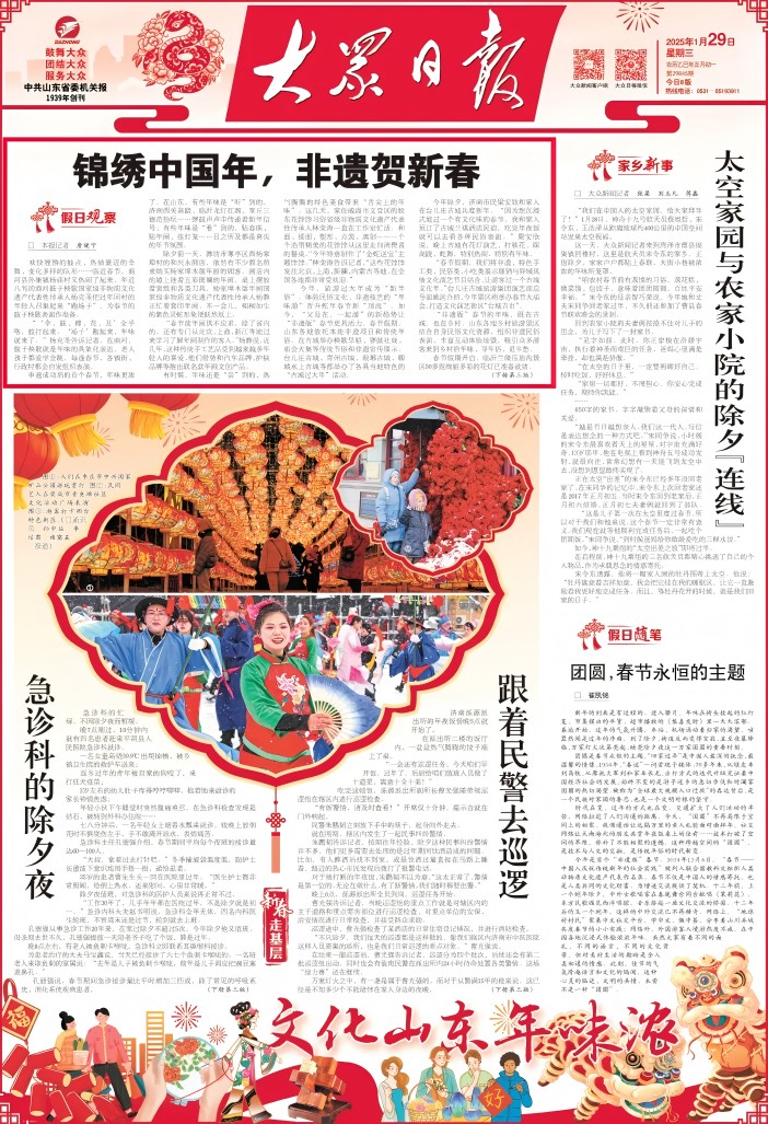 1月29日(正月初一),大眾日報頭版頭條刊發【假日觀察】專題稿件《錦繡中國年,非遺賀新春》,介紹了臺兒莊古城打造“非遺版”春節的年味,吸引眾多游客來到鄉村拾年味、尋年俗、覓鄉愁。