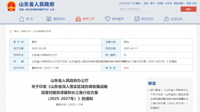 近日,山東省人民政府辦公廳印發《山東省深入落實區域協調發展戰略深度對接京津冀和長三角行動方案(2025-2027年)》。方案提到——