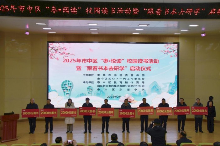 2月20日,2025年棗莊市市中區(qū)“棗·悅讀”校園讀書活動暨“跟著書本去研學(xué)”啟動儀式在東湖小學(xué)舉行。區(qū)領(lǐng)導(dǎo)田傳洋、胡少峰,區(qū)關(guān)工委領(lǐng)導(dǎo)王廣德,區(qū)教育局黨組書記周強,市新華書店領(lǐng)導(dǎo)楊冬梅參加,共同啟動2025年市中區(qū)“棗·悅讀”校園讀書活動暨“跟著書本去研學(xué)”活動。