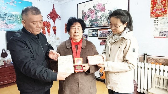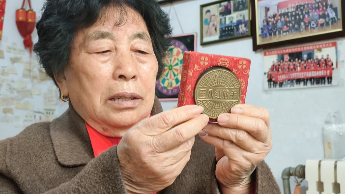 “三八”國際婦女節前夕,臺兒莊區檔案館工作人員來到全國三八紅旗手、山東省勞動模范黃墩秀家中進行走訪建檔。黃墩秀向檔案館的工作人員介紹了獲評全國三八紅旗手的相關事跡,并表示愿意將獲得的1983年全國三八紅旗手獎章、證書捐贈給臺兒莊區檔案館。(記者 岳娜 通訊員 劉同林 攝)