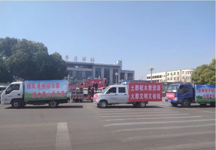 自3月17日起,一支由8輛宣傳車組成的殯葬政策法規(guī)宣傳車隊(duì)穿梭于薛城區(qū)的大街小巷、城鎮(zhèn)鄉(xiāng)村。每輛宣傳車的車身張貼著簡潔醒目的宣傳標(biāo)語,車載大喇叭循環(huán)播放禁售棺木、倡導(dǎo)火化、文明祭祀等政策標(biāo)語,同時,將殯葬法規(guī)政策制作成音頻,在各村居利用村廣播固定時間段播放宣傳,切實(shí)營造出“敲鑼打鼓式”喊話、“鋪天蓋地”式宣傳的局面,讓殯葬政策法規(guī)和殯葬移風(fēng)易俗理念深入人心、人人皆知。集中宣傳期間全區(qū)將累計(jì)出動車輛56次,發(fā)放倡議書3000余份,新增宣傳標(biāo)語100余個,每天播放音頻2小時,全區(qū)7個鎮(zhèn)街251個村居實(shí)現(xiàn)了殯葬政策宣傳全覆蓋。
