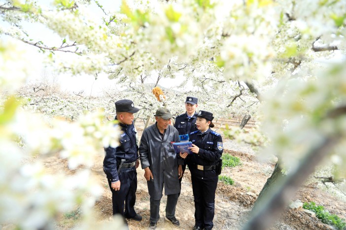 連日來,棗莊市山亭區公安分局開展“送法進田間”活動,組織民輔警利用李子花開的季節,果農忙著給李子花授粉,反詐意識淡薄,民輔警帶著“反詐明白紙”深入田間地頭向果農講解反詐知識,受到果農的好評。(王啟蒙 攝)