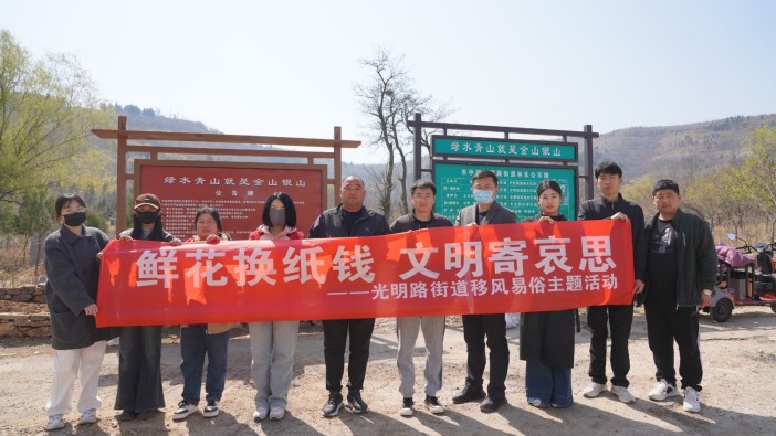 活動(dòng)中,志愿者設(shè)立文明祭掃宣傳點(diǎn),擺放好鮮花,向過(guò)往居民發(fā)放《移風(fēng)易俗倡議書》,耐心講解了焚燒紙錢帶來(lái)的安全隱患和對(duì)環(huán)境的污染,深入闡述了移風(fēng)易俗的重要意義,并以生動(dòng)豐富的案例,引導(dǎo)居民通過(guò)文明的方式表達(dá)對(duì)先人的思念之情,許多居民主動(dòng)用帶來(lái)的紙錢交換鮮花,進(jìn)行文明祭掃。