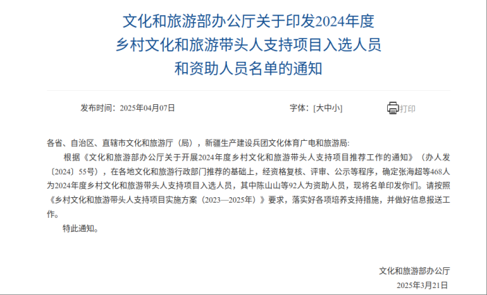 據悉,根據《文化和旅游部辦公廳關于開展2024年度鄉村文化和旅游帶頭人支持項目推薦工作的通知》(辦人發〔2024〕55號),在各地文化和旅游行政部門推薦的基礎上,經資格復核、評審、公示等程序,確定全國468人為2024年度鄉村文化和旅游帶頭人支持項目入選人員。何濤是文化和旅游部公布的2024年度鄉村文化和旅游帶頭人支持項目棗莊市唯一入選人員。