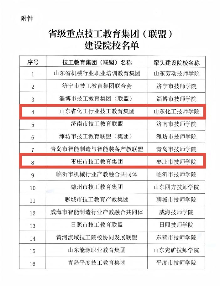 近日,省人力資源社會保障廳印發《山東省人力資源和社會保障廳關于公布省級重點技工教育集團(聯盟)建設院校名單的通知》,經各技工院校申報,各市人力資源社會保障局或主管部門推薦、專家評審,研究確定了省級重點技工教育集團(聯盟)建設院校名單16個。山東化工技師學院、棗莊技師學院分別作為山東省化工行業技工教育集團、棗莊市技工教育集團牽頭建設院校成功入選。