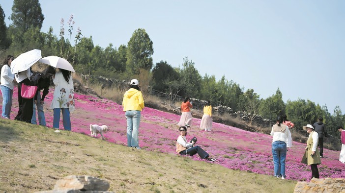 近日,春風(fēng)輕拂,鳳凰綠道的針葉天藍(lán)繡球如約綻放?;▋喝缌鲃拥牡靥轰仢M大地,仿佛打翻了大自然的調(diào)色盤。市民爭相奔赴這場視覺盛宴。(記者 單成鎮(zhèn) 楊舒 通訊員 王一涵 攝)