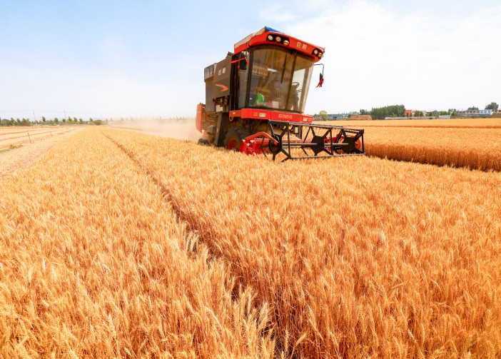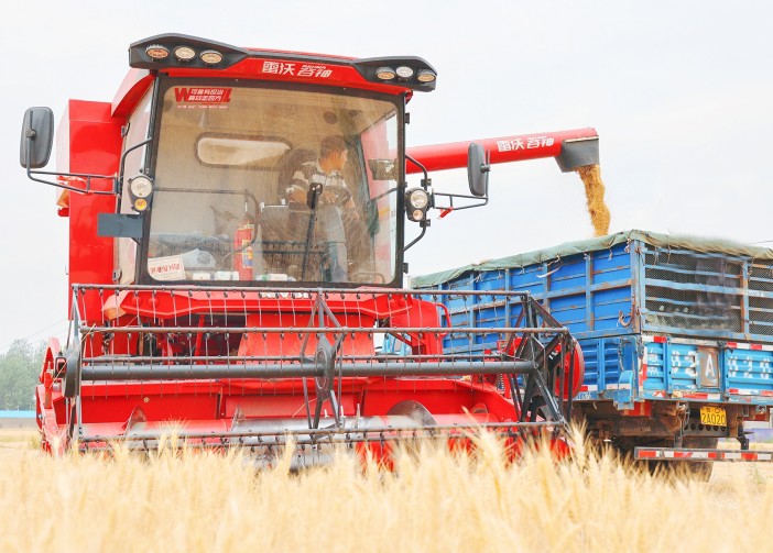 我市農民搶抓晴好天氣,組織農機全力搶收,確保夏糧顆粒歸倉。(記者 王龍飛 攝)