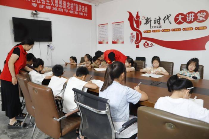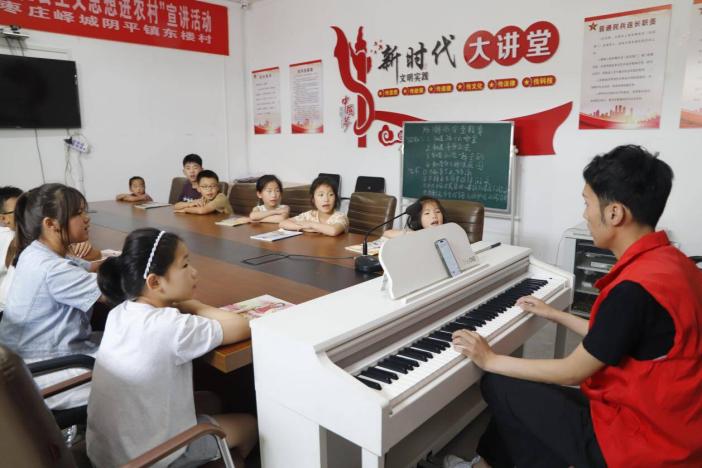 “西邊的太陽快要落山了,微山湖上靜悄悄……”7月11日,棗莊市嶧城區陰平鎮東樓村新時代文明實踐站內傳來陣陣歌聲,暑期大課堂如約而至。課堂上,孩子們在大學生志愿者的帶領下,正在進行樂理知識的學習。孩子們專注地打著節拍,稚嫩的歌聲在教室里回蕩,課堂氣氛熱烈而溫馨。