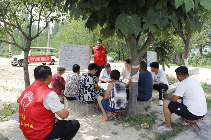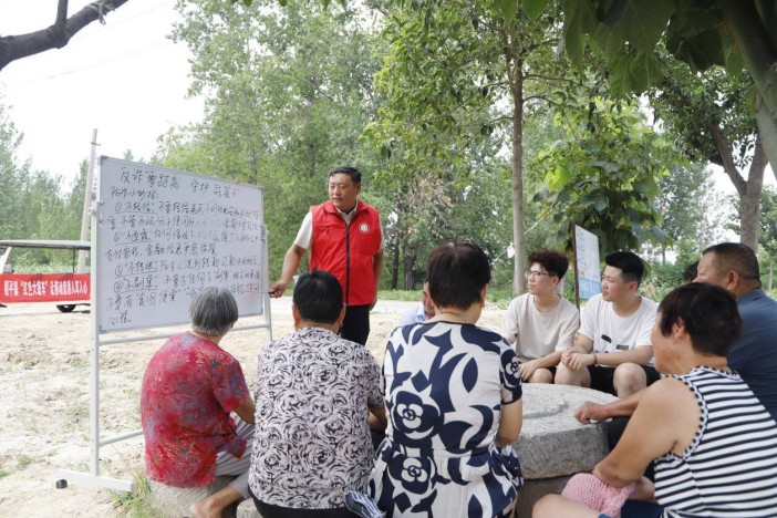 炎炎夏日,蟬鳴陣陣。7月14日,在棗莊市嶧城區陰平鎮東樓村枝繁葉茂的老槐樹下,一輛醒目的“紅色大篷車”停駐在陰涼處。不同于傳統的流動舞臺或政策宣傳車,今天的大篷車化身“移動安全課堂”,一塊便攜的“小黑板”支起,志愿者正用洪亮的聲音和接地氣的語言,為納涼的村民們帶來一堂關乎生命財產安全的“清涼課”——防溺水與反電信網絡詐騙知識宣講。