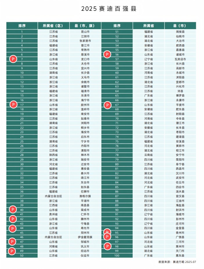 7月23日,2025縣域經(jīng)濟創(chuàng)新發(fā)展論壇在北京舉行。賽迪顧問發(fā)布《2025中國縣域經(jīng)濟高質(zhì)量發(fā)展研究》,并揭曉“2025賽迪百強縣”榜單,山東有12地入選,分別是:龍口市(7)、膠州市(17)、榮成市(40)、滕州市(42)、壽光市(44)、鄒城市(47)、招遠市(49)、諸城市(56)、平度市(67)、青州市(95)、廣饒縣(96)、萊州市(98)。