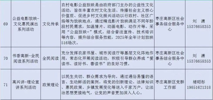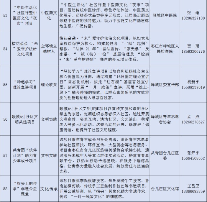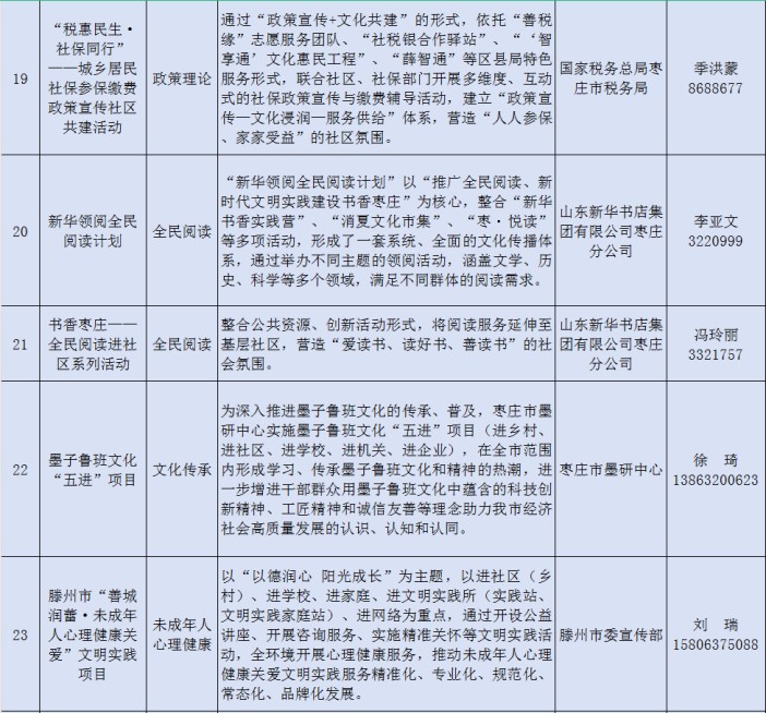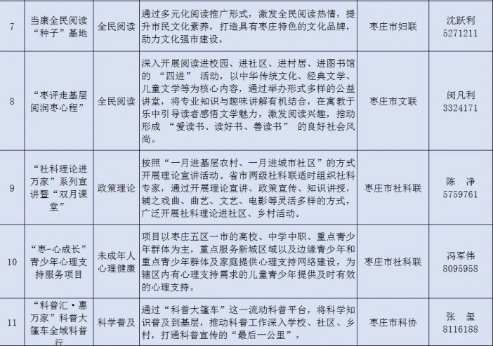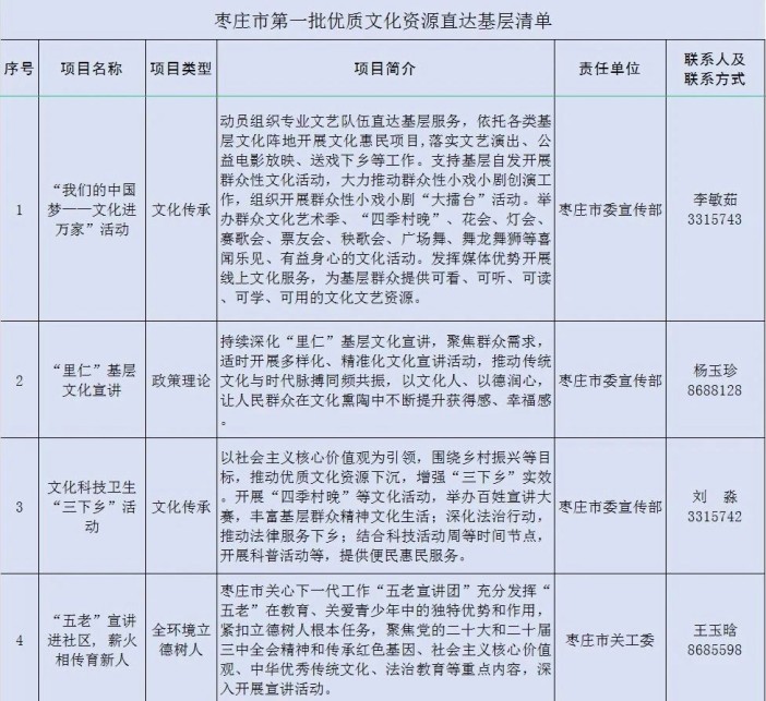 為深入推動優質文化資源直達基層,一體推進文化社區(文化書院)建設,市委宣傳部(市文明辦)從市直和各區(市)有關部門單位征集篩選了一批優質文化資源,涵蓋科學普及、家庭教育、文化傳承、技能培訓、全民閱讀等多個類別。現將第一批項目清單面向社會公布,全市各試點文化社區(文化書院)可根據實際需求聯系對接!