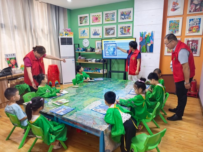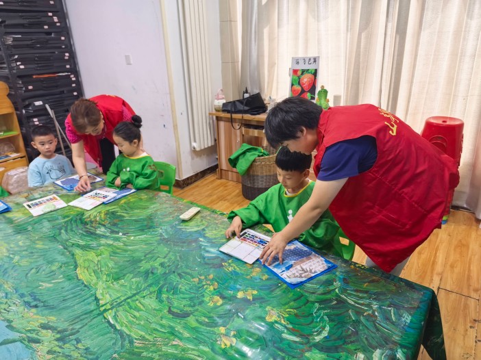 活動(dòng)現(xiàn)場(chǎng),長(zhǎng)桌上整齊擺放著各色水彩筆、海綿拓印工具、畫(huà)紙,墻角的展示架上還陳列著幾幅風(fēng)格明快的兒童繪畫(huà)作品,營(yíng)造出溫馨又充滿藝術(shù)氣息的氛圍。在活動(dòng)中,社區(qū)特意邀請(qǐng)的美術(shù)老師從基礎(chǔ)講起,用生動(dòng)的語(yǔ)言給孩子們講解繪畫(huà)的基本步驟:“先像搭小房子一樣把輪廓畫(huà)出來(lái),就像給故事搭個(gè)舞臺(tái)”。還通過(guò)展示紅與綠、黃與紫等對(duì)比色的搭配示例,讓孩子們直觀感受色彩碰撞的奇妙。