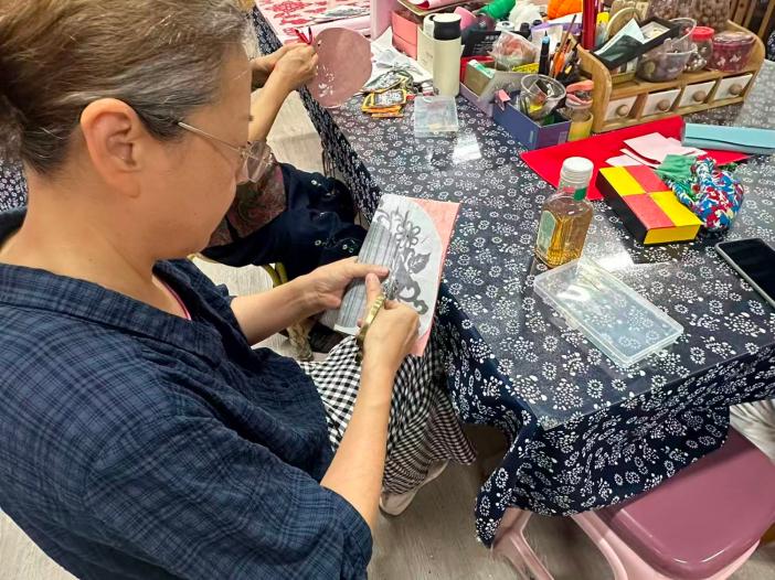 活動(dòng)現(xiàn)場(chǎng),陳秀蘭結(jié)合即將到來(lái)的教師節(jié),為大家講解本次剪紙創(chuàng)作的核心思路,并以模板為依托開(kāi)展教學(xué)。從如何將模板緊密貼合在彩紙上固定,到握剪姿勢(shì)與沿模板邊緣走刀的力度控制,再到剪完后移除模板、修整細(xì)節(jié)的方法,都細(xì)致演示。遇到居民操作卡頓,她會(huì)及時(shí)上前示范,耐心解答“模板貼不牢怎么處理”“剪到模板邊緣外怎么辦”等問(wèn)題,現(xiàn)場(chǎng)學(xué)習(xí)氛圍格外濃厚。