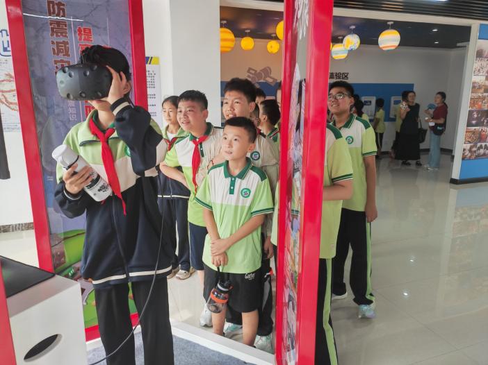 活動現場,同學們在志愿者引導下有序探索各展區。從精致的行星模型到有趣的物理實驗,豐富的展品與互動項目讓大家目不暇接。在“地震小屋”內,戴上VR眼鏡,便能聽見逼真的地震聲;觸摸墻壁,還能直觀感受縱波與橫波的差異。短短幾分鐘里,孩子們不僅牢記“伏地、遮擋、手抓牢”的自救口訣,更在緊張體驗中讀懂了地球的“脈搏”。