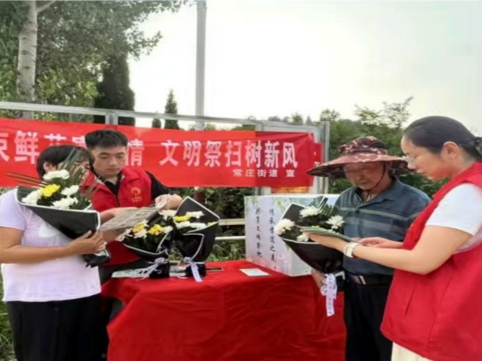 活動現場,紅色橫幅在微風中舒展,“一束鮮花寄親情 文明祭掃樹新風”“移風易俗我先行 平安中元守家園”等標語格外醒目,潛移默化間將文明理念傳遞給每一位前來祭掃的群眾。工作人員早早守候在服務點,手中捧著一束束新鮮的白菊、百合,微笑著為攜帶紙錢的群眾提供“鮮花換紙錢” 服務——接過群眾手中的傳統紙錢,遞上馨香的鮮花,一句 “用鮮花寄哀思,既環保又安全,這份心意同樣厚重”,讓不少群眾欣然接受。“以前總覺得燒點紙錢才顯心意,今天換了鮮花,看著清爽,也不會污染環境,確實更好。” 剛完成兌換的居民趙女士捧著鮮花,語氣里滿是認可。