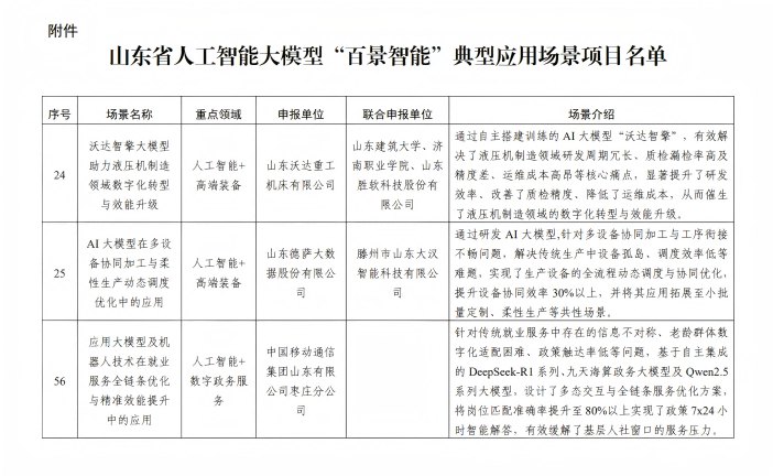 近日,省工信廳公布了山東省首批人工智能大模型“百景智能”典型應(yīng)用場(chǎng)景項(xiàng)目名單,我市3個(gè)項(xiàng)目成功入選,分別是:山東沃達(dá)重工機(jī)床有限公司的“沃達(dá)智擎大模型助力液壓機(jī)制造領(lǐng)域數(shù)字化轉(zhuǎn)型與效能升級(jí)”項(xiàng)目、山東德薩大數(shù)據(jù)股份有限公司的“AI大模型在多設(shè)備協(xié)同加工與柔性生產(chǎn)動(dòng)態(tài)調(diào)度優(yōu)化中的應(yīng)用”項(xiàng)目、中國移動(dòng)通信集團(tuán)山東有限公司棗莊分公司的“應(yīng)用大模型及機(jī)器人技術(shù)在就業(yè)服務(wù)全鏈條優(yōu)化與精準(zhǔn)效能提升中的應(yīng)用”項(xiàng)目。