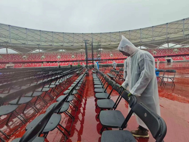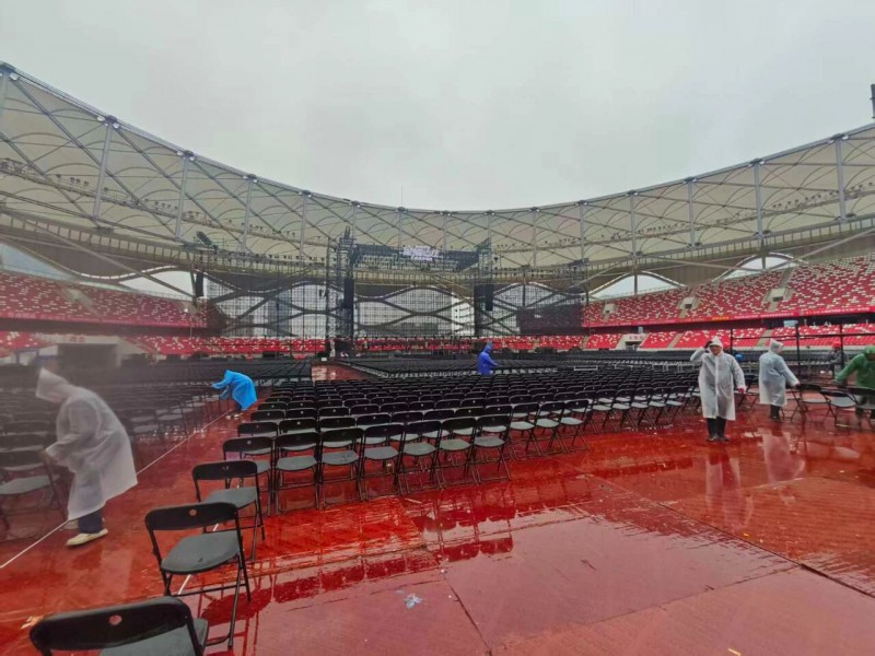 雖然現場下著雨,但絲毫不影響工作人員的熱情。音響、屏幕、控制臺等設施設備大部分已完成搭建,工人們正忙著布置內場座椅、架設電纜、搭建燈光等,為演唱會的到來做最后的沖刺。