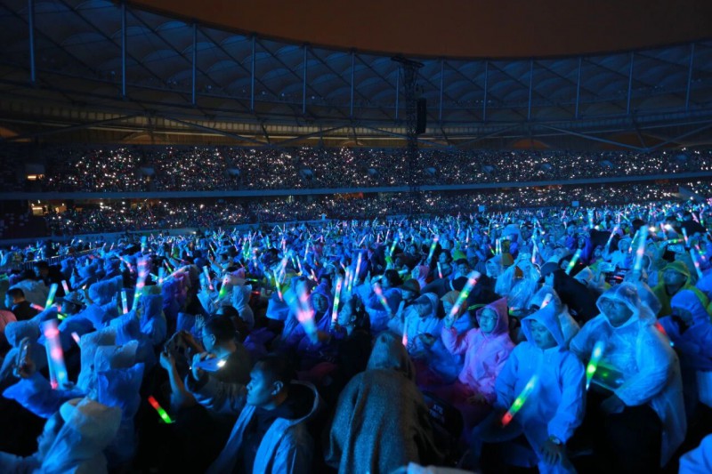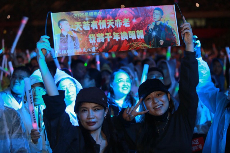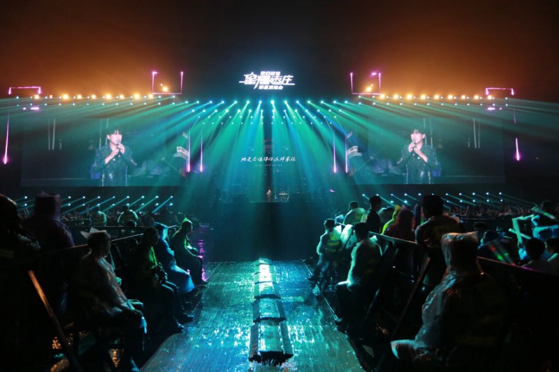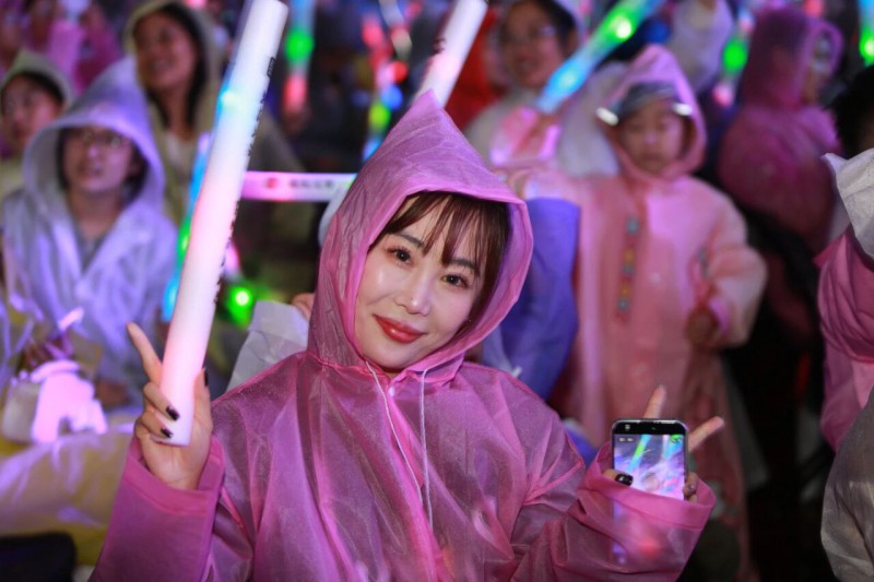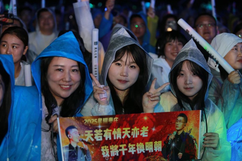 19:40左右,東方神話樂隊攜《廣寒宮》《江山辭》等國風曲目亮相,獨特的曲風為演唱會注入別樣韻味。當樂隊成員白雪提到 “棗莊的石榴特別好吃”,并向雨中堅守的歌迷表達感謝時,現場響起了經久不息的掌聲與歡呼聲。“雖然下雨有點不方便,但能聽到這么好聽的歌,還被藝人感謝,覺得特別值!” 帶著孩子來觀演的劉女士笑著說。而當《映山紅》《萬泉河水清又清》的紅歌旋律響起時,全場2萬名觀眾齊聲合唱,不少觀眾眼中滿是敬意,歌聲穿過雨幕,紅色情懷在體育場內久久回蕩。