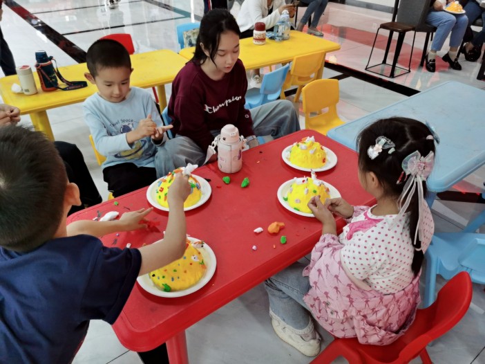 月亮燈兒童手工活動中,在志愿者老師的帶領下,孩子們把金黃粘土平攤在倒扣的塑料碗上,把碗面裹成一個個圓潤的“月盤”。接著進入“造景”時間,揪一小團白黏土搓成蠶豆大的玉兔身,牙簽輕挑兩抹長耳,再點兩粒黑芝麻眼,白云則先搓條再壓扁,用指腹推出波浪邊,輕輕粘在月亮表面,最后撒上星星、彩虹糖般的小裝飾——紅的星、藍的鉆、紫的花朵,一閃一閃。孩子們把自己的作品高高舉起,齊聲喊:“我把星空抱回家啦!”家長們紛紛按下快門,記錄下這張最浪漫的“節日合影”。