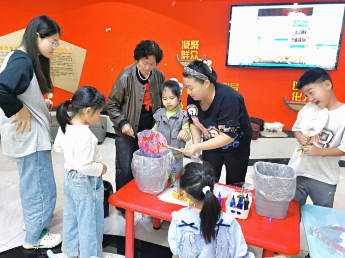 “非遺小工匠”課堂上,志愿者老師帶著十余名小朋友走進國風漆扇世界,樣式紛繁的素白扇面、五彩斑斕的各色顏料,滿足“小工匠”們的不同審美。調色桶里,朱紅、靛青、藤黃、花白、墨綠五色大漆相互碰撞,老師耐心示范漆扇制作的“滴、撥、旋、提”四步法:先在水面滴漆,再用竹簽輕撥紋理,扇面勻速旋轉入水,三秒后快速提起,瞬間開出獨一無二的“水中花”。孩子們驚呼:“像魔法一樣!”空氣里瞬間飄滿“中國式浪漫”的味道。