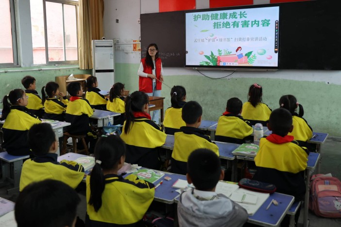 在活動中,孟莊鎮根據“掃黃打非” 主題設計豐富教學內容與多樣活動形式。課堂上,新時代文明實踐志愿者和老師結合學生年齡特點和認知水平,借助 PPT 演示、案例講解、動畫視頻等直觀方式,向學生詳細解讀 “掃黃打非” 的具體含義、重要意義,以及非法出版物、有害信息的特征與危害,讓抽象知識更易被學生理解。