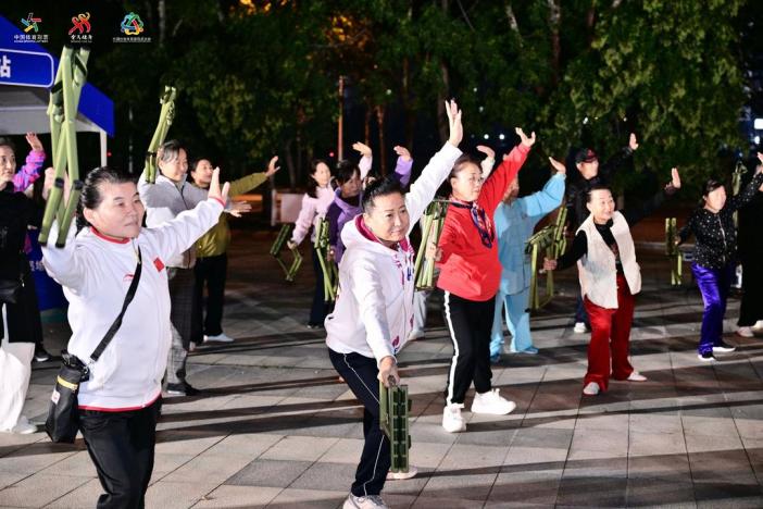 10月14日晚上,2025年“萬村女性社會體育指導員培訓計劃”交流展示大會配套活動之一的“小馬扎 大健康”傳統科學健身活動,在棗莊文體中心體育館館前廣場精彩上演。這項獨具特色的傳統健身活動吸引了來自全國各省代表隊、健身愛好者及當地居民群眾300余人積極參與。