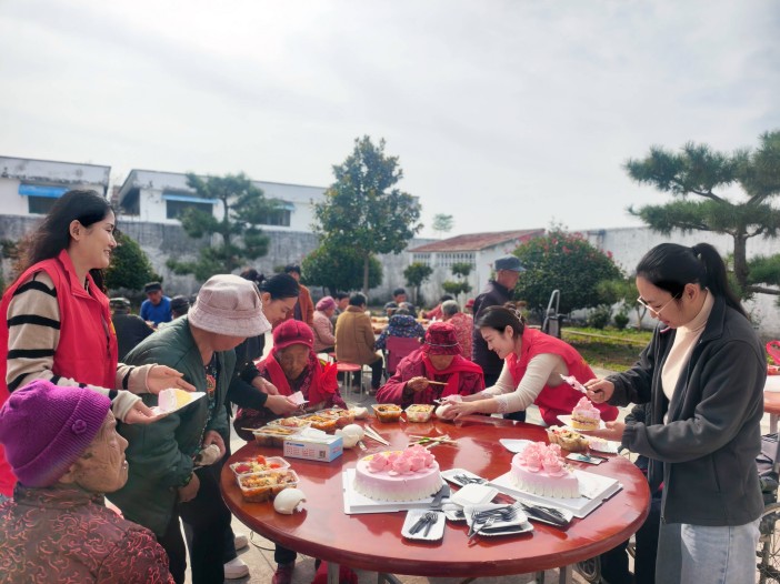 活動當天上午九點,吳家坡村委會大院內洋溢著喜慶與溫暖。現場布置得簡樸而隆重,鮮艷的“壽”字烘托出濃濃的祝壽氛圍,桌上擺放著精心準備的生日蛋糕,寄托著對老人們健康長壽的美好祝愿。在家人或志愿者的悉心陪伴下,老人們陸續來到現場,個個臉上綻放著喜悅與期待的笑容。