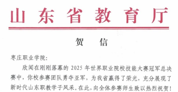 欣聞在剛剛落幕的2025年世界職業院校技能大賽冠軍總決賽中,你校參賽團隊勇奪亞軍,為我省贏得了榮光,充分展現了新時代山東職教學子風采。在此,向全體參賽師生致以熱烈祝賀!