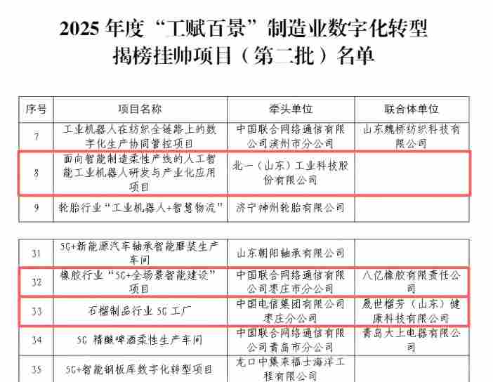 近日,省工信廳公示了2025年度“工賦百景”制造業數字化轉型揭榜掛帥項目(第二批)名單,我市3個項目成功入圍,分別是:北一(山東)工業科技股份有限公司申報的“面向智能制造柔性產線的人工智能工業機器人研發與產業化應用項目”、中國聯合網絡通信有限公司棗莊市分公司與八億橡膠有限責任公司聯合申報的“橡膠行業‘5G+全場景智能建設’項目”、中國電信集團有限公司棗莊分公司與晟世榴芳(山東)健康科技有限公司聯合申報的“石榴制品行業5G工廠”項目。