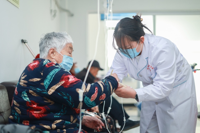 12月16日,在薛城區(qū)鄒塢醫(yī)養(yǎng)結(jié)合院區(qū),醫(yī)護人員在給老人進行靜脈輸液。 (記者 王龍飛 攝)
