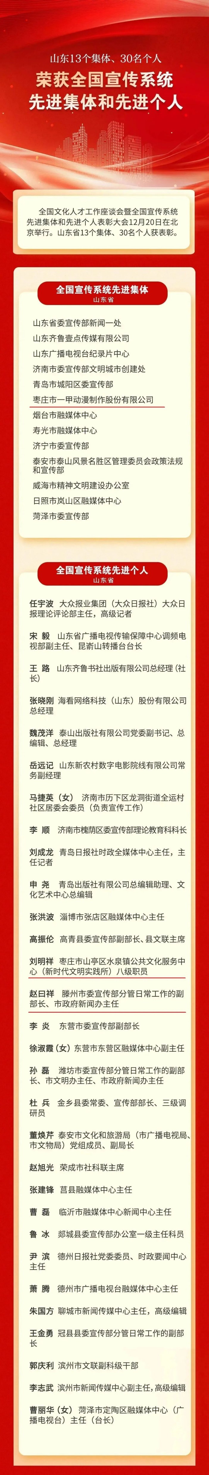 12月20日,全國文化人才工作座談會暨全國宣傳系統(tǒng)先進集體和先進個人表彰大會在北京舉行。棗莊市1個集體、2名個人分獲“先進集體”“先進個人”榮譽稱號。