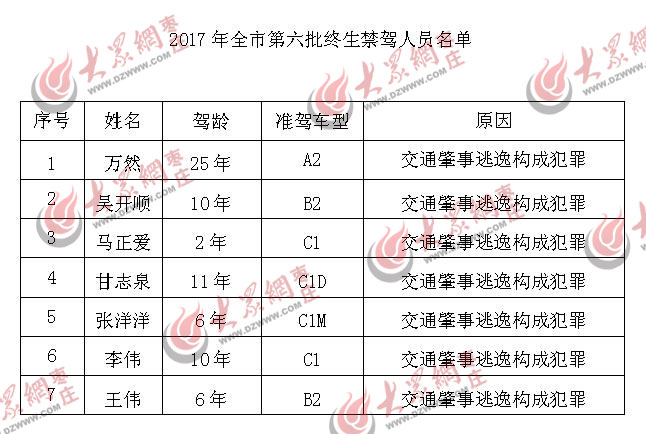 10月17日上午,棗莊市交巡警支隊(duì)召開(kāi)全市道路交通安全管理工作新聞通報(bào)會(huì),會(huì)上,棗莊市交巡警支隊(duì)公布了2017年第六批終生禁駕人員名單,7人上榜,禁駕原因均為“交通肇事逃逸構(gòu)成犯罪”。