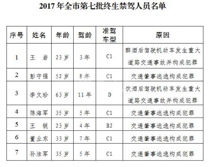 據了解,本次通報的7名被終生禁駕人員屬于造成交通事故后逃逸構成犯罪、飲酒后或醉酒駕駛機動車發生重大交通事故構成犯罪兩種情形,根據規定,由公安機關作出終生不得重新取得機動車駕駛證的處罰決定。其中醉酒后駕駛機動車發生重大道路交通事故并構成犯罪的駕駛人王巖與交通肇事逃逸構成犯罪的駕駛人王銳均只有23歲,為90后。