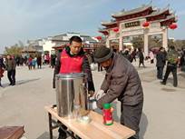 臺(tái)兒莊古城南門志愿者服務(wù)站,圖為我行員工身穿紅馬甲,為游客提供交通引導(dǎo)、景點(diǎn)介紹、供應(yīng)熱水、檢拾景區(qū)內(nèi)垃圾等服務(wù)