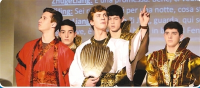 在當(dāng)?shù)嘏e辦的2018年中國農(nóng)歷春晚上,意大利羅馬住讀學(xué)校學(xué)生用漢語表演《三國演義》故事