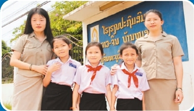 老撾萬象農(nóng)冰村小學(xué)學(xué)生與來自中國的漢語教師志愿者
